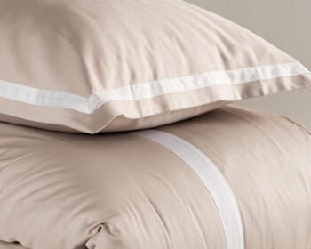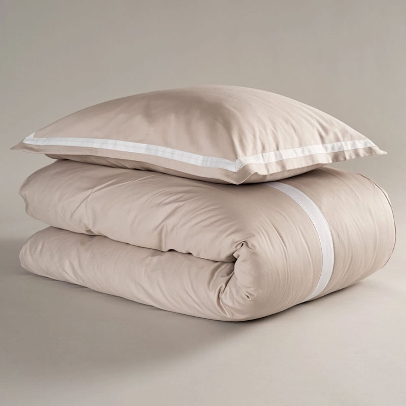 Stockholm från Grand Design, lyxigt påslakanset i extra sval och mjuk satin, med en design inspirerad av den skandinaviska enkelheten. Vacker silvrig färg som har en varm ton som drar åt beige.